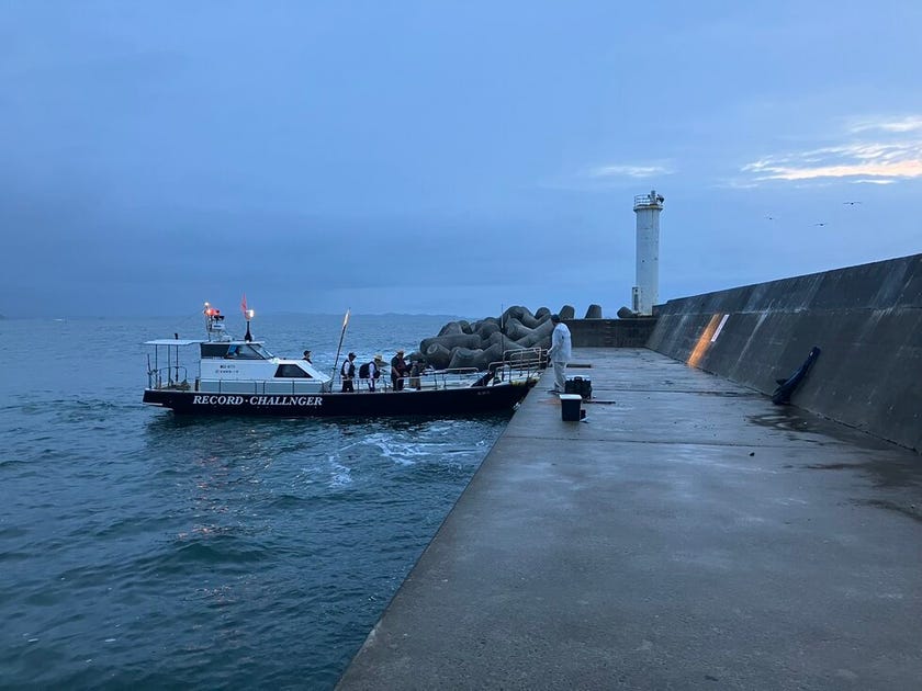 小雨の中、皆さん沖の堤防に渡船でやってきます。